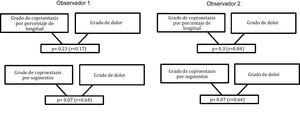 La asociación entre el grado de dolor abdominal y el grado de coproestasis fue diferente en las 2 escalas entre observadores (fig. 1). En la valoración de ambos observadores se obtuvo una mayor correlación entre el grado de coproestasis por segmentos y el grado de dolor con una p significativa (p<0.05). La asociación entre la intensidad del dolor abdominal y el grado de coproestasis observado por rayos X en la mayoría de los pacientes con grados moderado y grave de dolor fue con grados 2 y 3 de coproestasis.