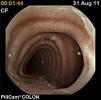 A 78-year-old man had no past history of chronic degenerative diseases and no complaints of dysphagia or swallowing disorders. He was hospitalized 3 years prior due to upper gastrointestinal bleeding from a gastric ulcer secondary to NSAID ingestion for which he received satisfactory combined endoscopic treatment. He continued with occasional NSAID ingestion. One year ago the patient began to present with postprandial fullness, a weight loss of 14kg during that year, and fecal occult blood on 2 occasions. Panendoscopy revealed a hiatal hernia and chronic gastropathy of the body and antrum. Colonoscopy showed uncomplicated diverticular disease of the descending colon and the sigmoid colon. The patient was referred for CE as part of the approach to OGIB. A bowel transit time test was done on the patient before he was given the capsule endoscope to swallow, and it was normal. There were no complications in relation to the preparation for CE.