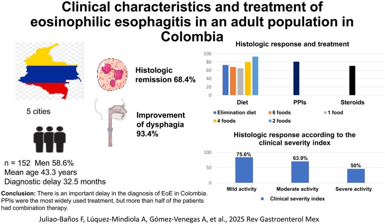 MethodologyA cross-sectional, analytic, multicenter study was conducted on adult patients with EoE in different Colombian cities. Gastroenterologists seeing adult patients were invited by email to take part in the study, resulting in the participation of 16 of them from the entire country, who work at different centers located in the following cities: Bogotá, Medellín, Bucaramanga, Manizales, and Cartagena. In principle, all adult patients with EoE, seen by the participating gastroenterologists at the emergency service, as hospitalized patients, or as outpatients, were included in the study.