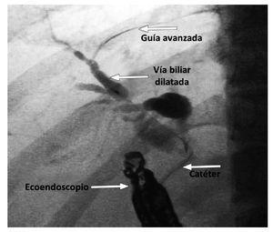 Una aguja específica para punción por USE, se ha desarrollado recientemente por Cook®, para insertar transduodenal en el conducto biliar distal. Para confirmar el acceso ductal de la aguja, el estilete se extrae y la bilis y se aspira. Si hay retorno de la bilis, el medio de contraste se inyecta en el conducto biliar por colangiografía, por tanto se requiere una guía de 450 cm de largo, de 0.035, 0.021 o 0.018 pulgadas, que se inserta a través de la cubierta exterior y su posición es confirmada por fluoroscopia. Si no hay retorno de la bilis o se aspira sangre, se retira la aguja y se lava con solución salina, para evitar la obstrucción y tratar de repetir la punción. Después de insertar la guía en el conducto biliar, la dilatación del sitio de punción suele ser necesario, utilizando un catéter de dilatación de vía biliar (Soehendra®, Cook® endoscopia), un dilatador de balón papilar (Maxpass®, Olympus Medical Systems, Tokio, Japón) o ambos secuencial (dilatador axial, luego dilatador de balón). Este está dirigido a la dilatación de la fístula duodenocoledociana, para facilitar la inserción de stent. Ésta es necesaria cuando no se emplea la cauterización inicial por CD-USE, pudiéndose usar un stent plástico o metálico de mayor calibre (10Fr), y dependiendo de la distancia al colédoco o cuando existe sensación de resistencia al avance de la aguja. Por último, un catéter biliar cola de cerdo de 5Fr a 10Fr, o un stent plástico, o uno metálico autoexpandible totalmente cubierto (Zeon® Medical Co. Ltd. Tokio, Japón), se inserta a través del sitio de la coledocoduodenostomía en el colédoco. El extremo proximal de la endoprótesis debe controlarse fluoroscópicamente y el distal por la endoscopia. Las prótesis metálicas tienden a acortarse desde las pocas horas después del procedimiento. La migración temprana de la prótesis metálica, puede ser causada por el acortamiento hacia el colédoco, más allá de la pared gastrointestinal. La adecuada selección de la longitud de la prótesis (15 a 20 mm), es un requisito indispensable para evitar esta complicación. Existen técnicas de anclaje adicionales para evitar la migración, mediante la dilatación stent con balón, hasta un diámetro de 10 mm o el uso de un stent coaxial, tipo doble cola de cochino.14