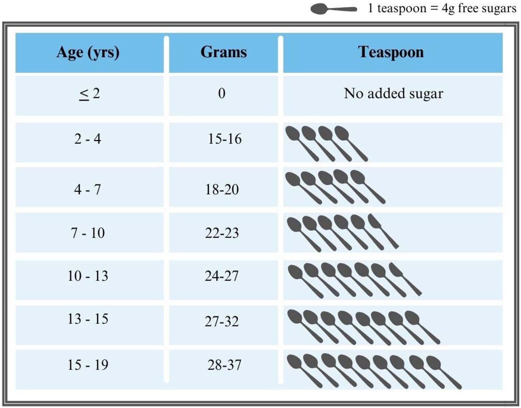 In addition, strategies should be started for avoiding or limiting added sugar consumption. The WHO,90 LASPGHAN,91 ESPGHAN,92 and AAP1 recommend no added sugar intake before 2 years of age and limiting added sugar consumption to < 5% of the daily energy intake in children 2–18 years of age. In an effort to guide parents and/or caregivers, the present Obesity Working Group adapted the measurement of simple sugar in grams to the equivalent in teaspoons for children above 2 years of age, recommended by the Nutrition Committee of the ESPGHAN (Fig. 4).92