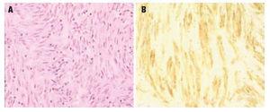 Foto 2. A. Imagen de microscopia óptica en la que se advierte la presencia de células de aspecto fusiforme con escasa actividad mitótica (H&E, x20). B. Positividad difusa al KIT, con tinción citoplasmática y perinuclear típica de los GIST (inmunohistoquímica, x20).