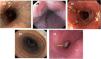 Endoscopic characteristicsTypical endoscopic abnormalities of EoE present in 70 to 90% of cases and include edema, linear furrows, esophageal rings, whitish exudates, and strictures (Fig. 2A-E).42 The edema, rings, exudates, furrows, stricture endoscopic reference score (EREFS), is utilized to describe and classify said alterations and has taken on an important role in clinical practice since its description in 2013 by Hirano et al.43 It is currently the most widely accepted system for evaluating endoscopic activity in EoE and has shown good interobserver concordance and correlation with treatment response and histologic activity.44–46 However, the absence of endoscopic abnormalities does not rule out the disease, thus a high degree of suspicion is needed on the part of the endoscopist, for deciding whether or not to take esophageal biopsies.