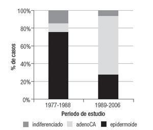En relación con el tipo histológico se hizo una comparación con la serie de casos de cáncer de esófago estudiados en el mismo instituto de 1 977 a 1988. Se compararon los 57 casos con cáncer de esófago estudiados de 1977 a 1988 con los 53 casos estudiados de 1989 a 2006. Encontramos un aumento significativo del adenocarcinoma no solamente alcanzando, sino sobrepasando al carcinoma epidermoide que era el predominante en la primera mitad del siglo anterior y aun a principios de los siguientes dos decenios. De 1977 a 1988 75% (43/57) fueron del tipo epidermoide y en el segundo periodo sólo 43% (23/53). El 55 % de los casos (30/53) de 1989 a 2006 fueron adenocarcinomas, aumento significativo respecto al primer periodo en el que este tipo histológico representó 11% (6/57, P < 0.001) de los casos, el resto de los casos fueron del tipo indiferenciado. La proporción de carcinoma epidermoide y adenocarcinoma cambió de 7:1 en el primer periodo a 0.8:1 en el segundo. En la figura 1 se muestra la distribución de los casos de acuerdo al tipo histológico en los dos periodos de estudio.
