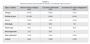 Los síntomas de presentación de la enfermedad más comunes, se muestran en el cuadro 2. Al comparar los casos con cáncer de esófago versus aquellos con adenocarcinoma de la unión esofagogástrica, se encontró menor frecuencia de disfagia (59% vs. 93%, P= 0.0001) y pérdida de peso (79% vs. 98%, P = 0.007) en el último grupo.