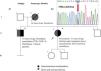 a) Genealogy with dominant autosomal pattern for hATTR. b) Electropherogram of the TTR gene (GENOS MÉDICA laboratory). Red arrow: pathogenic variant in the heterozygous state, a change from thymine to adenine (TTR c.210T>A) that affects the amino acid sequence (p.Ser70Arg) in the transthyretin protein.