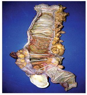 Paciente masculino de 75 años de edad. Ingresa a urgencias por presentar herida penetrante en abdomen, por objeto punzocortante. Se realiza laparotomía, en la cual se encuentra lesión hepática grado II, no sangrante, hemoperitoneo de 200 mL, ninguna otra lesión. Durante la revisión se encuentra tumor apendicular, de base ancha totalmente integrado al ciego, de aproximadamente ocho a 10 cm de longitud (Figuras 1 y 2). Se informa al paciente de dicho hallazgo y la necesidad de resección, aceptando y realizándose preparación para cirugía de colon.