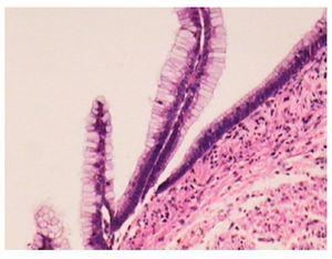¿ Figura 4.Corte microscópico que muestra epitelio cilíndrico papilar. (Tinción hematoxilina-eosina, 40x).
