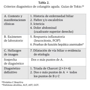 Tabla 2. Criterios diagnóstico de colangitis aguda. Guías de Tokio.12