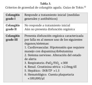 Los pacientes con colangitis aguda que no presentan disfunción orgánica y responden al tratamiento médico inicial (antibióticos y cuidados generales) se clasifican como enfermedad leve (Grado I). Cuando la respuesta al tratamiento médico inicial no es adecuada, continuando con SRIS y/o sepsis incluso requiriendo un cambio en esquema antibiótico y/o drenaje se clasifica como enfermedad moderada (Grado II). La presencia de disfunción orgánica define la enfermedad severa (Grado III). (Tabla 3)
