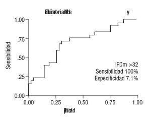 Figura 1. Curva ROC para la utilidad de IDFm (al ingreso) en predicción de mortalidad a siete días en pacientes hospitalizados con HA. El Área Bajo la Curva (ABC) representa la utilidad predictiva del IFDm y es de 0.69 (IC 0.56-0.82).