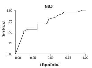 Figura 2. Curva ROC para la utilidad de MELD (al ingreso) en predicción de mortalidad a siete días en pacientes hospitalizados con HA. El Área Bajo la Curva (ABC) representa la utilidad predictiva de MELD y es de 0.73 (CI 0.61-0.86).