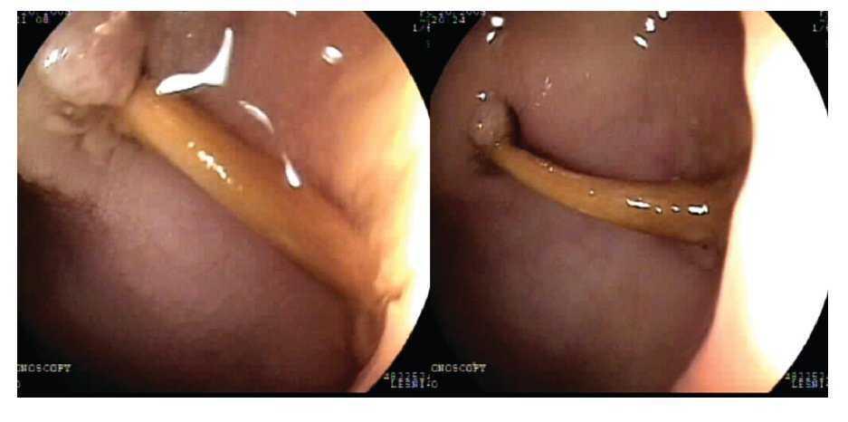 Figure 2. Colonoscopy revealed a foreign body in the sigmoid that was perforating the colonic wall. The foreign body was removed with a polypectomy snare and was ultimately identified as a chicken bone.