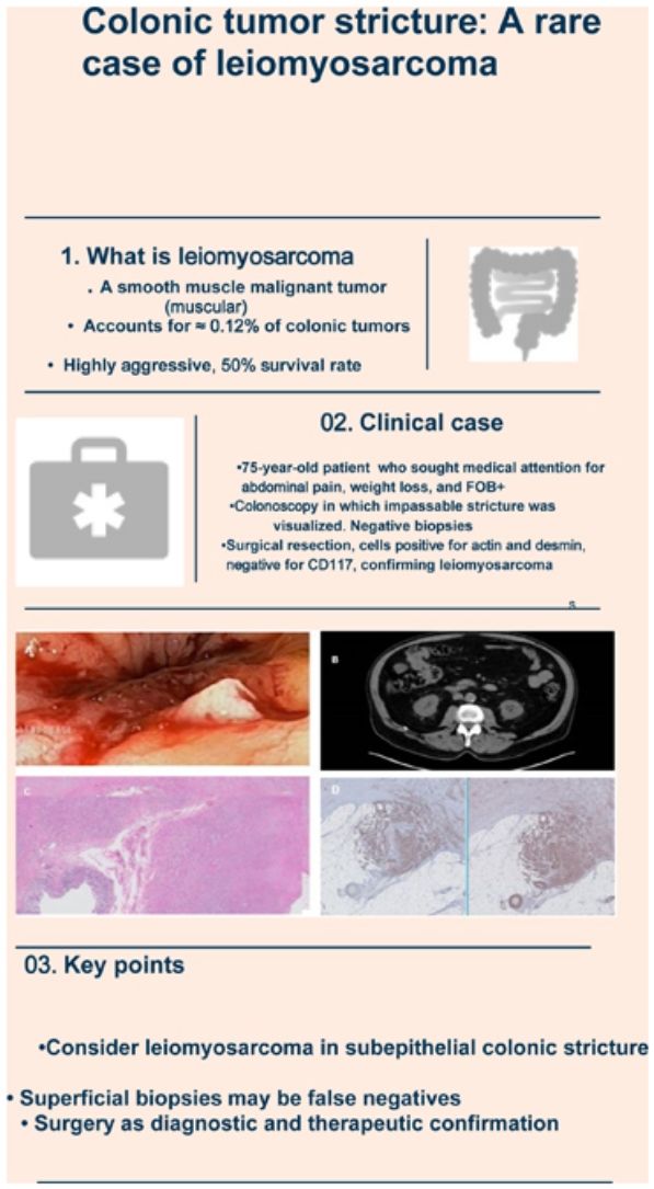 NETs of the colon are differentiated from neuroendocrine carcinomas by their degree of aggressiveness. They have an estimated prevalence of 5.2/100,000 persons/year,4 and a mean patient age at diagnosis of 63 years.5 Diagnosis can be delayed 5–7 years, underlining the importance of timely evaluation.6 NETs account for 25% of all gastroenteropancreatic neuroendocrine carcinomas. They are aggressive in the colon, unlike those located in the appendix and rectum, which are more indolent. Their detection is mainly incidental but they are also associated with abdominal pain, rectal bleeding, chronic secretory diarrhea, weight loss and/or anorexia.7 Gastroenteropancreatic NETs have a high metastatic capacity, affecting the liver, lymph nodes, peritoneum, bone, and lung.8 Diagnosis is based on the combination of morphology through endoscopic, imaging, and immunohistochemical studies, due to the presence of serotonin-producing enterochromaffin cells. They are positive for synaptophysin, chromogranin A, and CD56 and should be classified as well-differentiated G1/G2/G3 tumors; when they share non-neuroendocrine histology, they should be classified as poorly differentiated.9 Surgical resection is the treatment of choice whenever feasible.10 Unfortunately, clinical and pathologic characteristics do not always enable patients at a high risk for recurrence or metastasis to be selected. Most of these tumors are detected at advanced stages and have a 5-year survival rate of 71% in stage 1 and 10% in stage IV.11