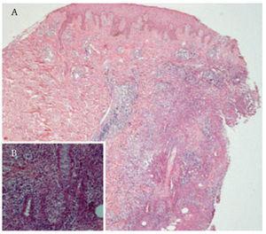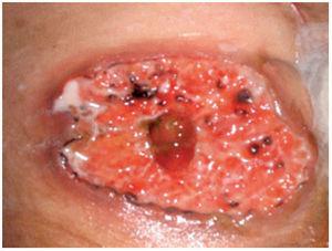 Reporte del casoSe trata de una mujer de 52 años con diagnóstico de CU de 10 años de evolución. Como única manifestación extraintestinal presentaba artritis periférica. Debido a la presencia de displasia de alto grado en biopsia obtenida por colonoscopia, fue sometida a una proctocolectomia con reservorio ileoanal e ileostomía en asa. El periodo posoperatorio de la paciente transcurrió sin complicaciones y se egresó a los cinco días. Seis semanas después de la cirugía, la paciente refirió un dolor intenso en el área periostomal. A la exploración se observó una gran úlcera que rodeaba el estoma con secreción purulenta y necrosis en los bordes (figura 1). Ésta se trató inicialmente como una falla en el manejo del estoma con dermatitis de contacto y una infección agregada. La paciente recibió tratamiento con antibióticos orales y capacitación en el manejo de estoma. Después de dos semanas, la lesión empeoró y apareció una nueva úlcera en la región escapular derecha de iguales características, pero más pequeña (figura 2). El diagnóstico se realizó por medio de una biopsia. En el estudio histopatológico de la piel periostomal se observó inflamación aguda y crónica en la dermis y en el tejido adiposo (HE-40X) (figura 2). También se observaron abscesos y vasculitis, así como migración de polimorfonucleares hacia la pared vascular (125X). Los cultivos de las biopsias no desarrollaron colonias. La paciente no tenía evidencia de enfermedad intestinal activa. El tratamiento se realizó con 40 mg al día de prednisona orales y con cuidados locales de la úlcera, incluyendo debridación bajo anestesia local. Las úlceras cicatrizaron a los seis meses de tratamiento y al año no presentó recurrencia.