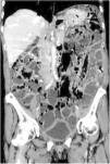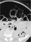 A previously healthy 65-year-old woman presented with symptoms of colicky abdominal pain and intense bloating, nausea and vomiting, and 8kg weight loss within the past 12 months. Her vital signs were stable, and she had no signs of peritoneal irritation. Abdominal angiotomography identified diffuse pneumatosis intestinalis with a predominantly cystic pattern, as well as abundant intraperitoneal free air, free fluid in the pelvic cavity, and no alterations in the mesenteric vasculature (figs. 1-3). Her laboratory test results ruled out gastrointestinal, infectious, oncologic, rheumatologic, pulmonary, and pharmacologic causes that would explain the tomographic findings. The patient received treatment based on metronidazole, probiotics, and prucalopride, and presented with partial symptom improvement, but no remission of the radiologic findings after 6 months of follow-up. The present case illustrates the fact that not all patients with pneumatosis intestinalis or pneumoperitoneum should be managed surgically. Pneumatosis cystoides intestinalis is a rare radiologic finding of unknown etiology. The differential diagnosis includes numerous causes, particularly intestinal ischemia. Treatment consists of antibiotics, prokinetics, hyperbaric oxygen, or endoscopic lesion resection, with varying results. Its clinical progression tends to be chronic and benign.