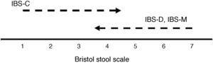 Figure 1. Improvement of abdominal pain and bloating in relation to the Bristol Matrix. A scale that corresponds to stool consistency measured by the Bristol Stool Scale is shown. For IBS-C, improvement should be from left to right, whereas for IBS-D and IBS-M it should be from right to left.