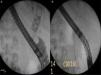 Luego de 6 semanas se realizó una nueva colangiografía endoscópica donde se observó hiperplasia del tejido papilar sobre el extremo distal del stent (fig. 2). Insuflando un balón dilatador de 12mm en el interior del stent se logró desimpactar el tejido hiperplásico y se pudo retirar el mismo con un asa de polipectomía.