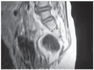 Figura 3. Agenesia parcial del sacro y lesión sacular en región anterior sacra (IRM).