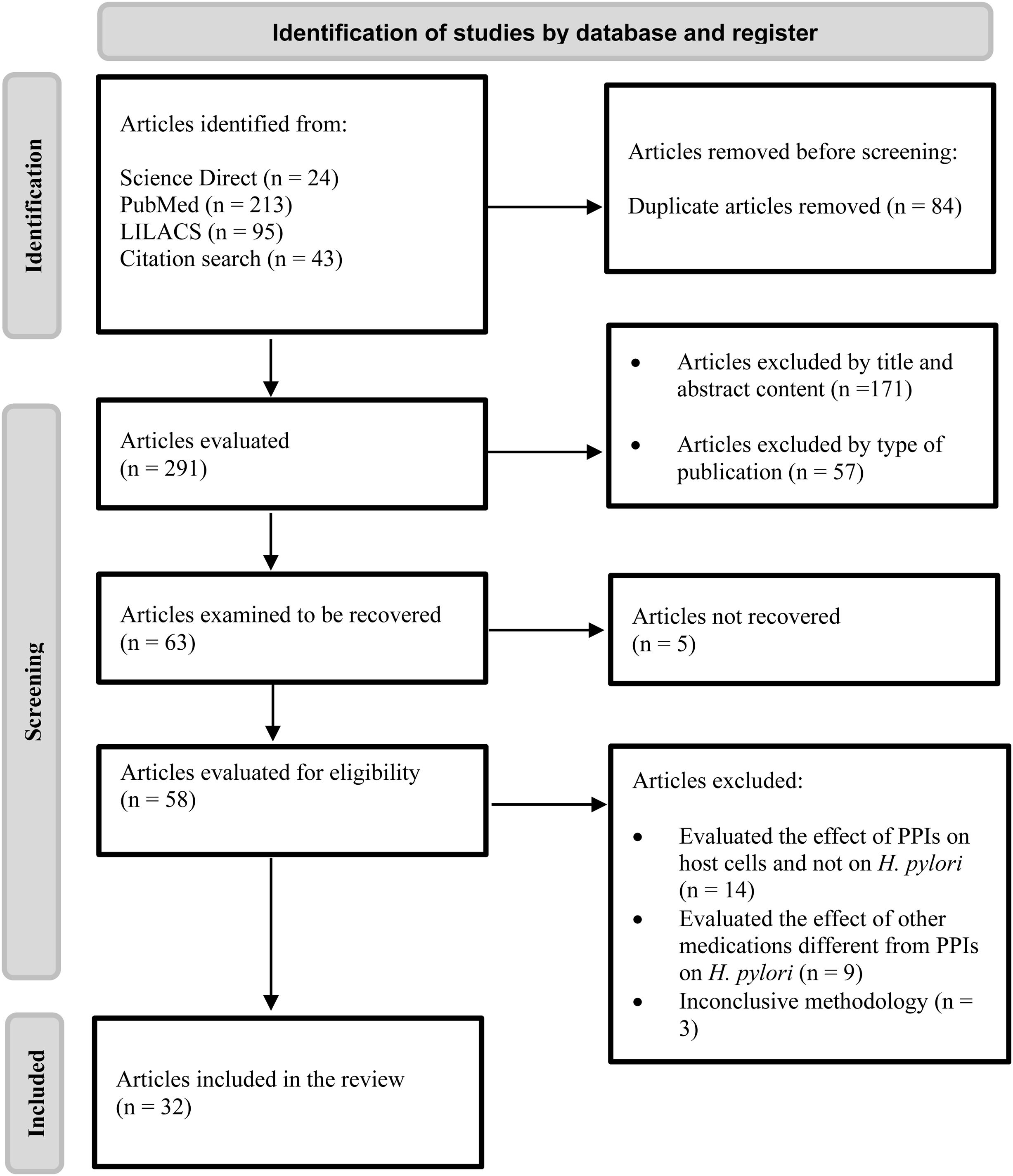 ResultsFollowing the search strategy, a total of 375 articles were identified. Twenty-four were identified from the Science Direct database, 213 from PubMed, 95 from LILACS, and 43 from other sources. Of the 375 articles, 84 were excluded because they were duplicates and 57 were excluded due to the type of article, after which 171 articles were excluded based on their titles and abstracts, leaving a total of 63 articles with complete texts to be read. Of those 63 articles, 31 were eliminated because they evaluated the effect of PPIs on the host cells and not on H. pylori, studied medications different from PPIs, had inconclusive methodologies and/or were not available for complete reading. Applying those criteria, 32 articles were obtained for the systematic review. Fig. 1 shows the flowgram that outlines the results, once the inclusion and exclusion criteria were applied. Table 2 shows the articles included in the review and the evaluated effect.