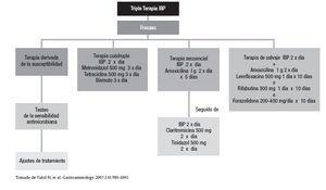 Posteriormente al fallo de un esquema conteniendo claritromicina, esta droga no debería reutilizarse dado el alto índice de resistencia secundaria que presenta. En forma similar no sería lógico el uso de nitroimidazoles salvo en una cuádruple terapia. Nuestra posición actual al respecto, de acuerdo con los criterios antedichos, es utilizar una triple terapia con levo- floxacina durante 10 días o una cuádruple terapia ante el fallo de una triple conteniendo claritromicina.