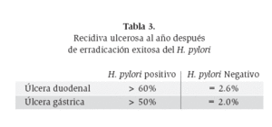 Tabla 3. Recidiva ulcerosa al año después de erradicación exitosa del H. pylori