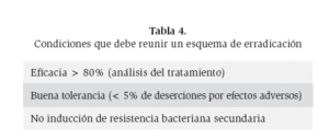Indicaciones de erradicación del H. pyloriEn 1994, en la primera conferencia de consenso de Institutos Nacionales de Salud de Estados Unidos, se determinó que los pacientes ulcerosos, con infección por H. pylori, deberán recibir tratamiento antimicrobiano sumado al antisecretor, tanto se trate de la primera presentación de la enfermedad o de una recurrencia. Además, se concluye que el valor de erradicación en pacientes con dispepsia funcional debe ser aun determinado, y que la interesante relación entre el H. pylori y las neoplasias gástricas requieren seguir siendo investigadas. En 1990 (Maastricht I), en 1999 (Maastricht II) y recientemente, en el 2007 el consenso de Maastricht III, recomendó nuevos lineamientos en las indicaciones de tratamiento de erradicación.1 (Tabla 1)