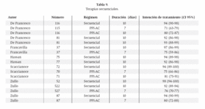 Un reciente trabajo comparativo entre la terapia secuencial con la triple terapia convencional encontró que la primera, a 10 días tiene un porcentaje de erradicación significativamente más alto (91%, por el análisis de intención de tratar modificado) comparado con la triple terapia por 10 días (78%, por el análisis de intención de tratar modificado). De particular interés fue el éxito de la terapia secuencial en pacientes con cepas resistentes a claritromicina. En ellos el porcentaje de erradicación fue de 89% con terapia secuencial y 29% con triple terapia Standard. A pesar que la terapia secuencial es corrientemente considerada como terapia de segunda línea, la confirmación de su eficacia en otros países conduciría a considerarla seriamente como terapia inicial.22,28,29-32,44,52,53