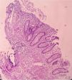 A previously healthy 48-year-old man came to the emergency service presenting with diffuse abdominal pain of three-month progression, associated with periods of diarrhea, bloating, and weight loss of approximately 10kg. Upon admission, his vital signs were within normal parameters and abdominal examination showed no peritoneal irritation, masses, or visceromegaly. A calprotectin stool test reported fecal calprotectin of 2,351μg/g (reference value:<50μg/g) and a lower gastrointestinal barium x-ray revealed filiform contrast medium passage at the level of the ileum (string sign) (Fig. 1). During colonoscopy, active ulcerative ileitis was observed, with a polyp at the mouth of the ileocecal valve. The anatomopathologic study reported mild diffuse chronic inflammation (Fig. 2). Given the diagnostically inconclusive results, magnetic resonance enterography was performed, and the findings were consistent with Crohn’s disease (CD) (Fig. 3 A and B). Treatment for moderate ileal CD was indicated: induction therapy with oral steroids and the later addition of thiopurines for remission maintenance. At three months of follow-up, the patient experienced symptom improvement, weight gain, and the absence of flare-ups.