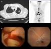 El primer caso corresponde a un hombre de 86 años, exfumador, que ingresó por síndrome general y anemia asintomática. Se identificó en estudios de imagen complementarios (ecografía y tomografía computada [TC] abdominal) afección duodenal inespecífica. Al examen endoscópico se observó que el duodeno presentaba signos de infiltración neoplásica. El análisis histológico reveló que se trataba de un carcinoma pobremente diferenciado no microcítico de origen pulmonar. La TC de tórax evidenció un nódulo espiculado de 15×19×20mm en el lóbulo superior izquierdo sugestivo de tumor primario pulmonar (CAM 5.2 y TTF1 positivos) (fig. 1 A). Dada la edad del paciente, su comorbilidad y su calidad de vida previa en grado 3-4 de la Eastern Cooperative Oncology Group (ECOG) se decidió manejo paliativo, falleciendo a los 4 meses.