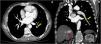 Tomografía computarizada en la fase arterial. Las flechas amarillas muestran defectos de llenado parciales en las ramificaciones arteriales de segmento en el lóbulo inferior del pulmón izquierdo, que corresponde a embolia pulmonar. No existe evidencia de metástasis pulmonar. La flecha roja revela trombos tumorales dentro de la vena hepática derecha. A) Plano transversal. B) Plano coronal.