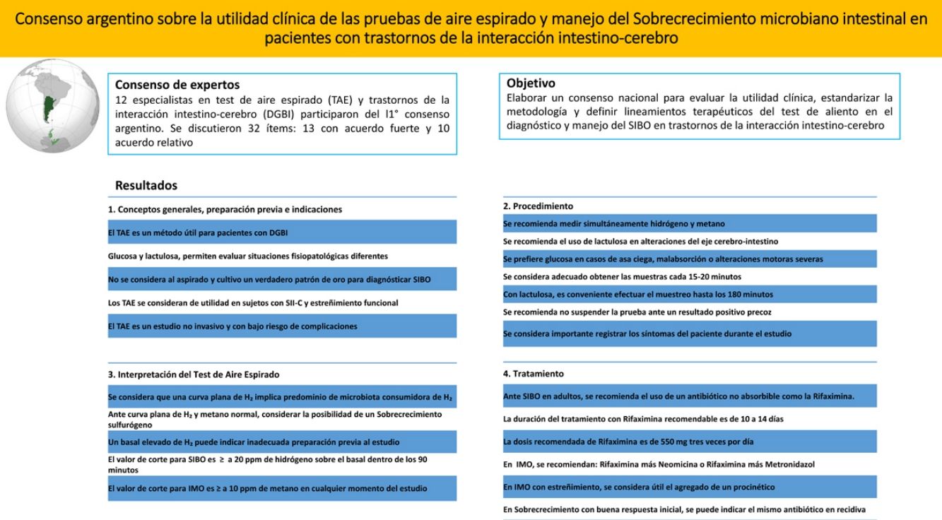 Se presentan los resultados de una reunión de consenso formal llevada a cabo en Argentina, cuyo objetivo fue analizar y discutir aspectos conceptuales, técnicos y clínicos relacionados con el uso del test de aire espirado (TAE) en el diagnóstico y tratamiento del sobrecrecimiento microbiano intestinal en pacientes con trastornos de la interacción intestino-cerebro (Disorders of Gut-Brain Interaction [DGBI]).