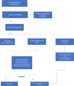 En lactantes con regurgitación excesiva, en ausencia de signos y síntomas de alarma, con una adecuada ganancia de peso, el explicar los motivos por los que los lactantes regurgitan (gran volumen de alimentación proporcional, alimentación líquida, posición supina) y la evolución natural de los síntomas (mejoría espontánea entre los 6 y los 18 meses en la gran mayoría) logra disminuir la ansiedad de los padres y la exigencia de tratamiento. Las regurgitaciones casi nunca son razones para dejar de amamantar. En lactantes no amamantados se recomienda el uso de una fórmula espesada, con lo cual disminuirá la regurgitación y, por lo tanto, disminuirá la preocupación de los padres. En estos niños puede recomendarse el uso de fórmulas espesadas y valorar la evolución en las dos siguientes semanas; en caso de mejoría, la fórmula espesada puede continuarse hasta los 6 meses de edad, o hasta los 12 meses de edad si los síntomas reaparecen con una fórmula no espesada.