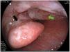 He was previously evaluated at the otorhinolaryngology service, and because a fiber optic laryngoscope was not available, evaluation at the gastroenterology service was requested. A barium esophagogram was performed and its results were normal. Considering that some segments of the respiratory tract are visualized during upper gastrointestinal endoscopy, the procedure was carried out. No lesions were found at the level of the esophagus, stomach, or duodenum, but during the removal of the equipment, the hypopharynx was examined, identifying a friable, granulomatous lesion located in the right glossoepiglottic fold extending to the epiglottis (Figs. 1 and 2). Multiple biopsy samples were taken. The histochemical Ziehl-Neelsen stain was positive, indicating tuberculosis. The patient was HIV negative and a chest tomography scan showed no lesions, confirming the diagnosis of primary hypopharyngeal tuberculosis. Anti-tuberculosis drug therapy was begun, and the patient’s progression is currently satisfactory.