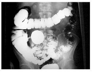 Steenvoorde7 analizó los estudios de imagen de 135 pacientes con divertículo colónico gigante y encontró que de 104 casos que tenían radiografías de abdomen, en casi todas se observó una estructura de tipo ovoidea conteniendo gas, que se considera característica de divertículo gigante. En 8% de los casos evidenció aire libre o neumomesenterio debido a perforación del divertículo. El diagnóstico definitivo se realizó en su mayoría mediante estudios contrastados como en el caso que presentamos. La tomografía abdominal también fue de utilidad para demostrar el divertículo y evidenció comunicación con el intestino.14 Según Steenvorde,7,15 en 64% de 111 pacientes a los que se practicó colon por enema se demostró la comunicación con el colon pero su uso está contraindicado cuando se sospecha perforación La colonoscopia no ha demostrado gran utilidad para el diagnóstico ya que en la mayoría de los casos el ostium es demasiado pequeño y no permite diferenciar entre una diverticulosis y un divertículo gigante y puede favorecer la perforación.16