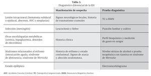El diagnóstico diferencial debe realizarse con otra serie de procesos que cursan con un cuadro clínico similar como la intoxicación alcohólica aguda, el delirium tremens, el síndrome de Wernicke-Korsakoff, trastornos hidroelectrolíticos, el hematoma subdural, lesiones ocupantes de espacio intracraneales.12 Las principales enfermedades que se deben considerar en el diagnóstico diferencial de la EH crónica se muestran en la Tabla 3.