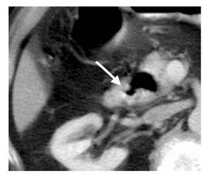 En siete casos (14%) el Dd causaba un efecto de masa sobre estructuras adyacentes (rango de diámetro de 2.1 a 7.1 cm). Además, el Dd fue condicionante de pseudolesión focal en la cabeza pancreática en 14 casos (28%). Se identificaron tres casos (6%) de Dd yuxtapapilar, uno de ellos que se complicó con sangrado del tubo digestivo y fue el de mayores de dimensiones (7.1 cm por 4.4 cm). No se identificaron Dd asociados a coledocolitiasis (Figura 4).