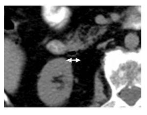 En la bibliografía4 se señala a la segunda porción como el sitio más común de localización de los Dd hasta 83% de los casos. En nuestro estudio encontramos 29% ubicados en la segunda porción y 44% en la tercera porción, lo que representa una diferencia sustancial. La TC permite precisar la localización anatómica y las relaciones que tiene el Dd con estructuras adyacentes.