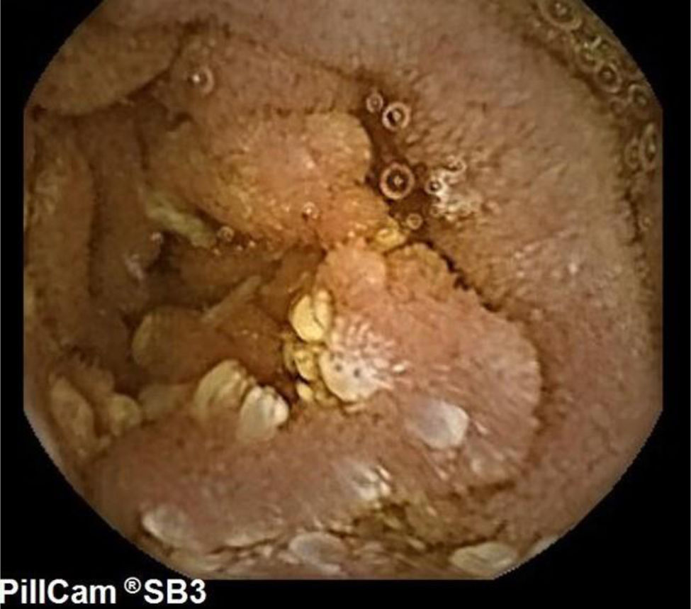 Cápsula endoscópica: se observa afectación en forma de micronódulos de forma parcheada, alcanzando tramos más distales de duodeno.