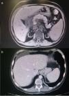 Exámenes complementarios: Analítica: glucosa 106mg/dl, urea 163mg/dl, creatinina 3.74mg/dl, amilasa 631UI/l, lipasa 1027U/l, GOT 53U/l, GPT 68U/l, GGT 196U/l, FA 80U/l, LDH 676U/l, calcio 6.3mg/dl, PCR 1.07mg/l, sodio, potasio y coagulación normales. Hemograma: Hb 12.1g/dl, Hto 38.5%, VCM 99fl, leucocitos 10.050μl con 8.610μl de neutrófilos, plaquetas 100.000μl. PCR CMV negativo. Carga viral VHC 17600000UI/ml. Autoinmunidad y marcadores tumorales normales (tabla 1). TAC de abdomen y RMN del páncreas y colangio-RM de vías biliares: compatibles con pancreatitis aguda intersticial con bajo índice de severidad (Figura 2 a y b). Eco-endoscopia normal. La paciente cumplía criterios analíticos y de imagen de pancreatitis aguda intersticial leve según criterios de Atlanta. Cultivos de exudados de MMII negativos para bacterias y hongos.