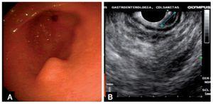 ¿ Figura 1. A. Endoscopia. Lesión subepitelial en curvatura mayor del antro gástrico. B. Endosonografía. Lesión hipoecoica de la segunda capa (muscularis de la mucosa) de la pared de antro gástrico.