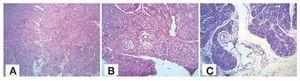 ¿ Figura 3. A, B. Tinción con hematoxilina-eosina. Acinos pancreáticos con presencia de conductos y ocasionales islotes de Langherhans con configuración lobular. C. Tinción de ácido peryódico de Schiff (PAS).