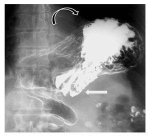 ¿ Figura 2. Serie gastroduodenal en que la flecha horizontal indica la localización de la unión gastro-esofágica. La flecha curva muestra el desplazamiento del estómago en su eje longitudinal.