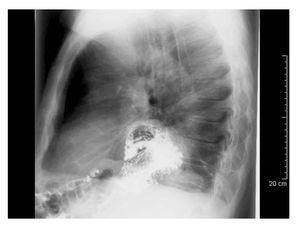 ¿ Figura 3. Serie gastroduodenal proyección lateral que muestra la torsión gástrica en sentido anteroposterior.